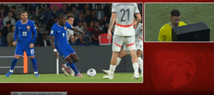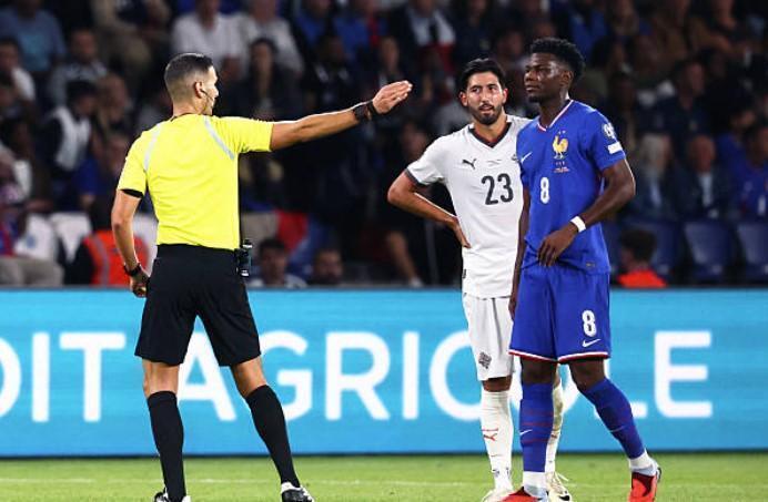 第68分钟,效力皇马的后腰琼阿梅尼铲中罗斯泰因松小腿,主裁回看VAR直红将其罚下,法国队被罚下1人。