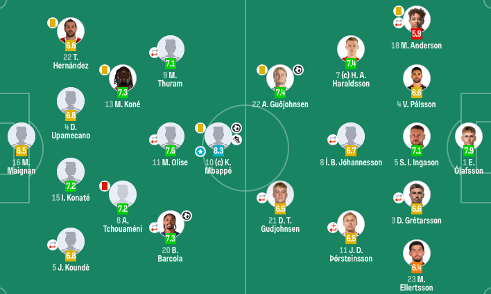法国首发:16-迈尼昂、5-孔德(63'17-古斯托)、15-科纳特、4-乌帕梅卡诺、22-特奥、8-琼阿梅尼、13-科内、20-巴尔科拉(63'7-科曼)、11-奥利塞、9-小图拉姆(70'14-拉比奥特)、10-姆巴佩
