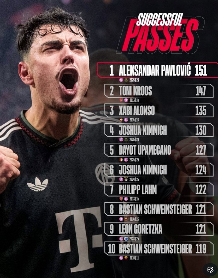 1月23日讯 在本轮欧冠拜仁2-0击败圣吉罗斯的比赛中,帕夫洛维奇完成151次成功传球,此数据创造了拜仁球员在单场欧冠纪录,以下为具体榜单: