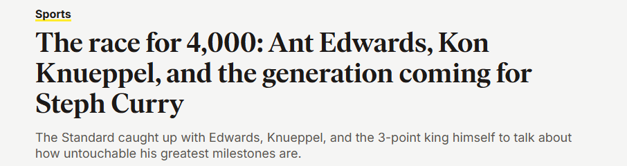 库里盯上了两位年轻球员:森林狼球星安东尼-爱德华兹,以及黄蜂新秀康-克努佩尔。前者是同年龄历史三分最多的球员,后者则是本赛季联盟新秀三分王。全明星赛前一个月,勇士都和这两队交过手,他们都承认,库里的纪录虽令人望而生畏,但生涯总三分比单季402记更有希望实现。