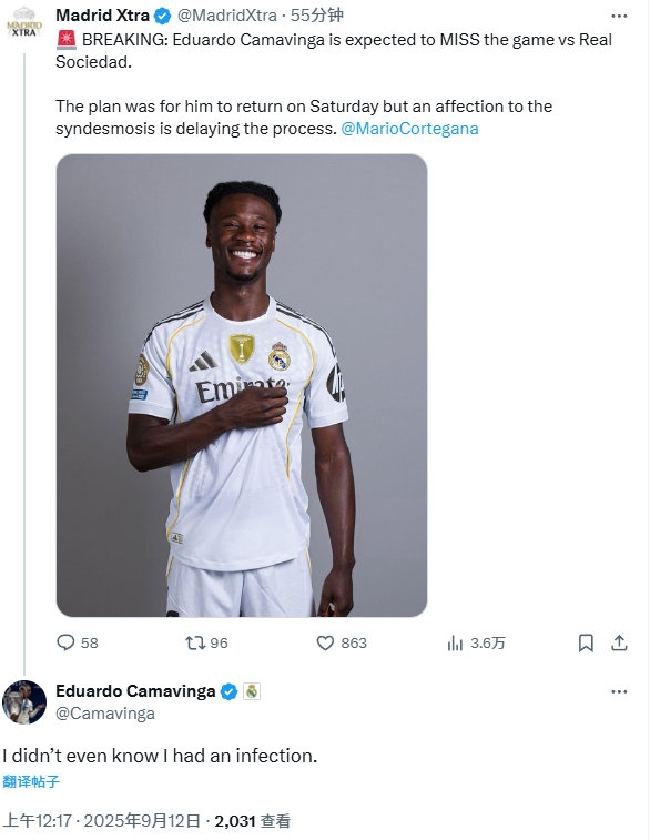 “TA:卡马文加伤缺vs皇社”,卡马文加:我咋不知道自己伤了🤣